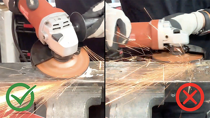Los discos de corte se usan en perpendicular al material sobre el que están trabajando, es decir, con un ángulo de 90º con respecto a la superficie. Si el disco se inclina, la superficie plana roza contra la pieza. El roce que se produce debilita el grosor del disco y, como resultado, se incrementa el riesgo de rotura.